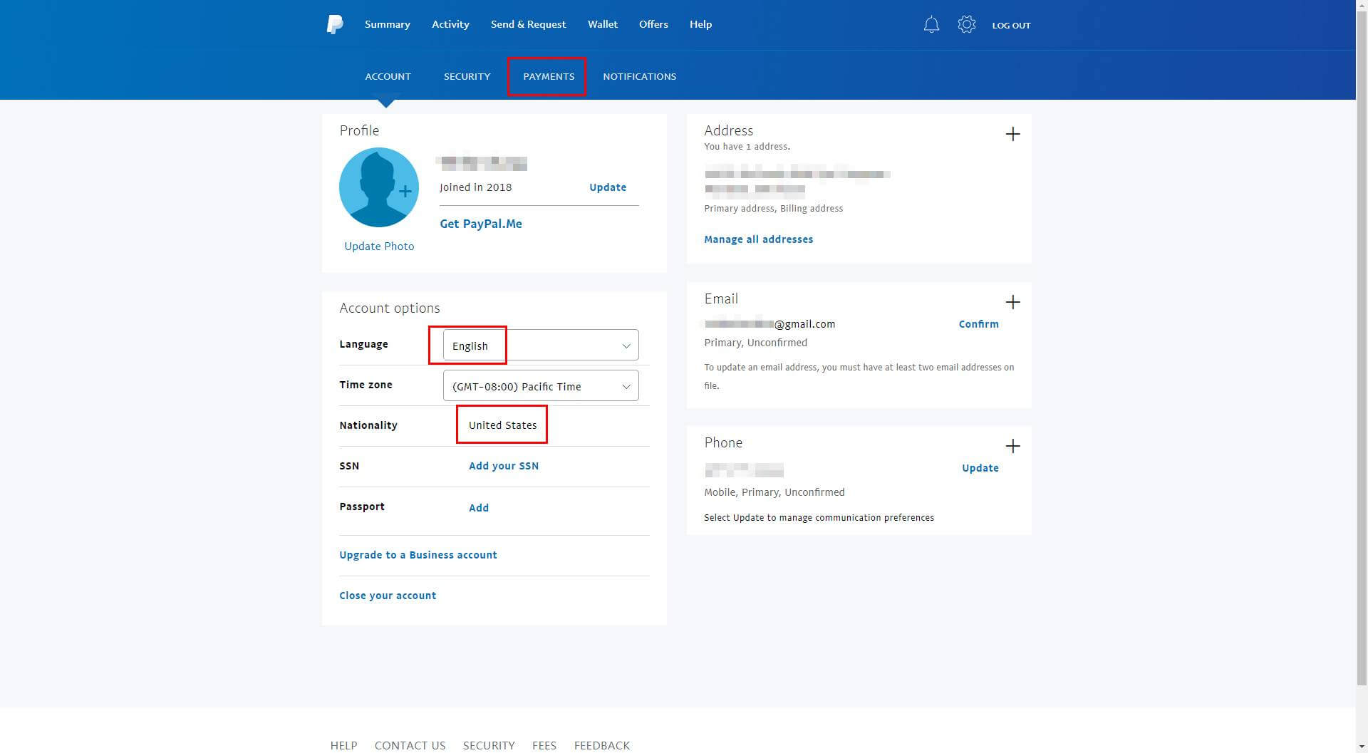 验证完成后,再次进入账户页面,确认你的国家为 United States,语言可选择简体中文,SSN 和 Passport 不管。然后点击页面上方的 PAYMENTS: