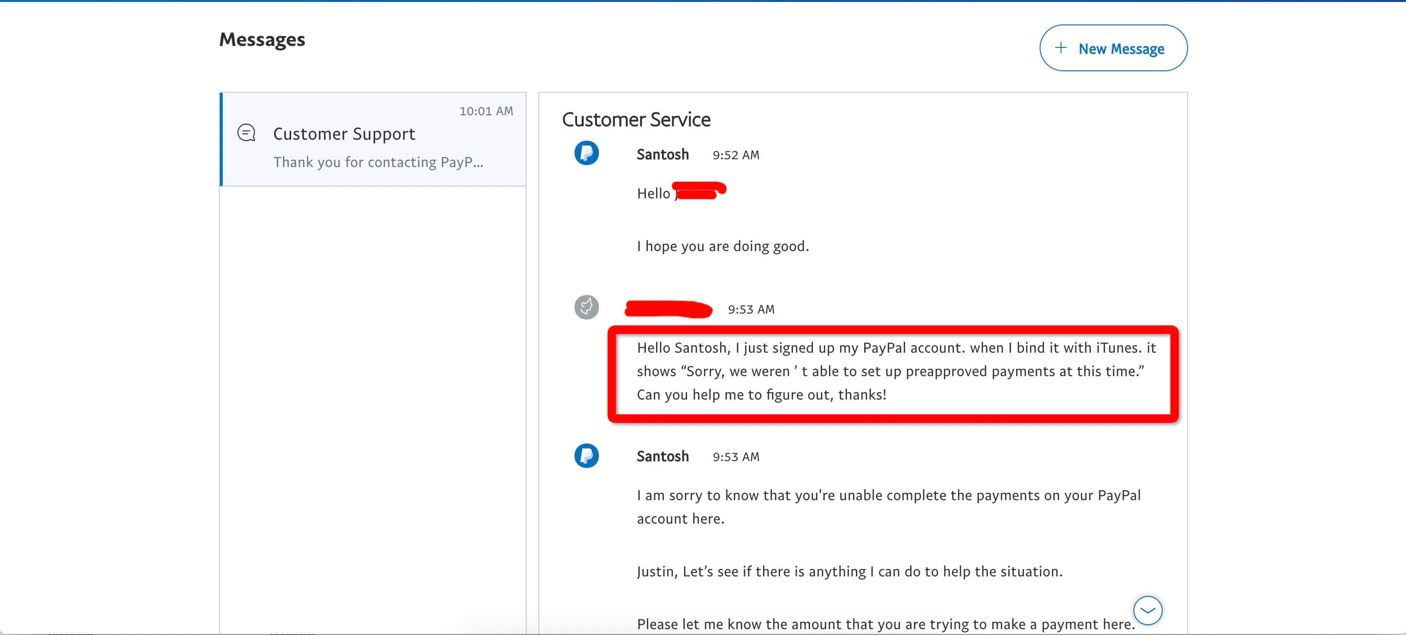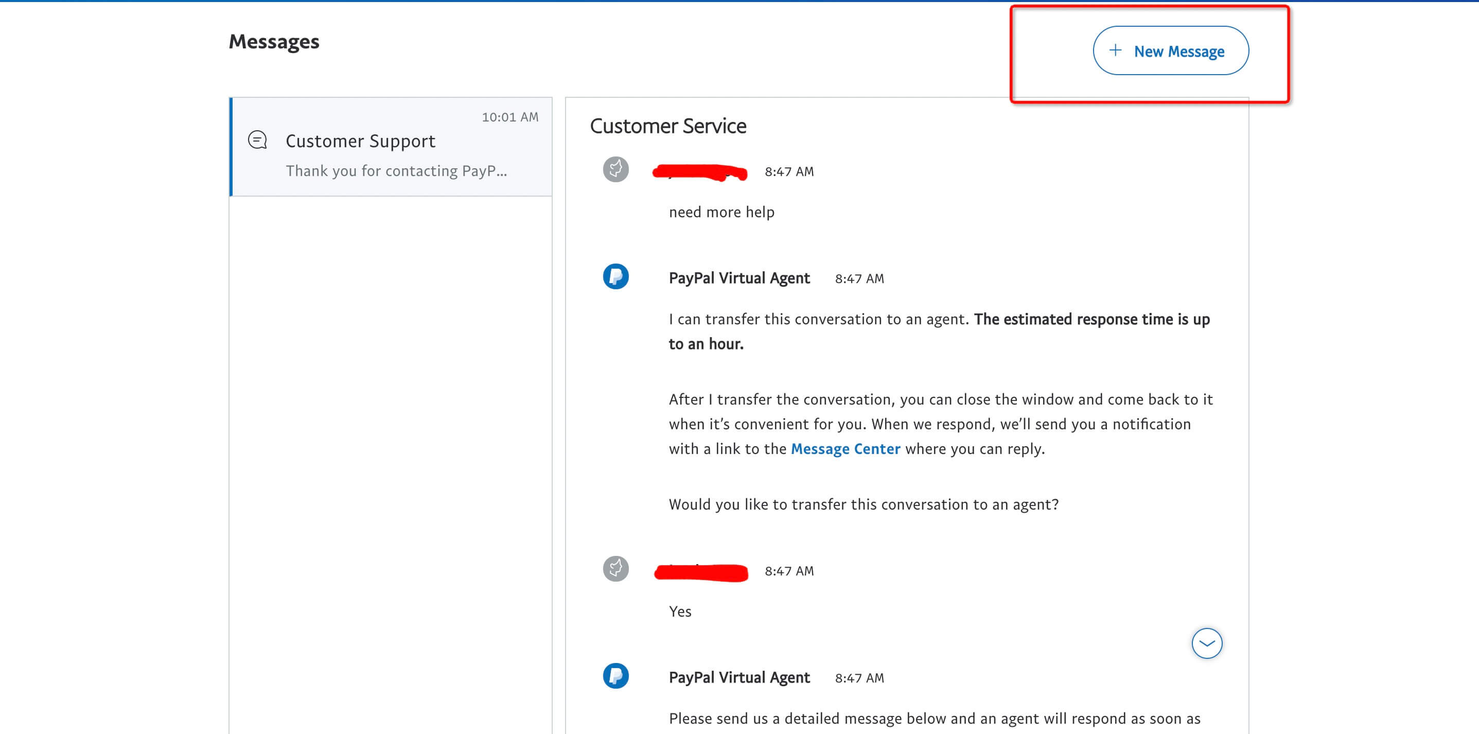 出现这种情况的话,直接在 Paypal 网站上联系在线客服,点击 [该链接]进入 PayPal Message Center,点击 New Message 按钮: