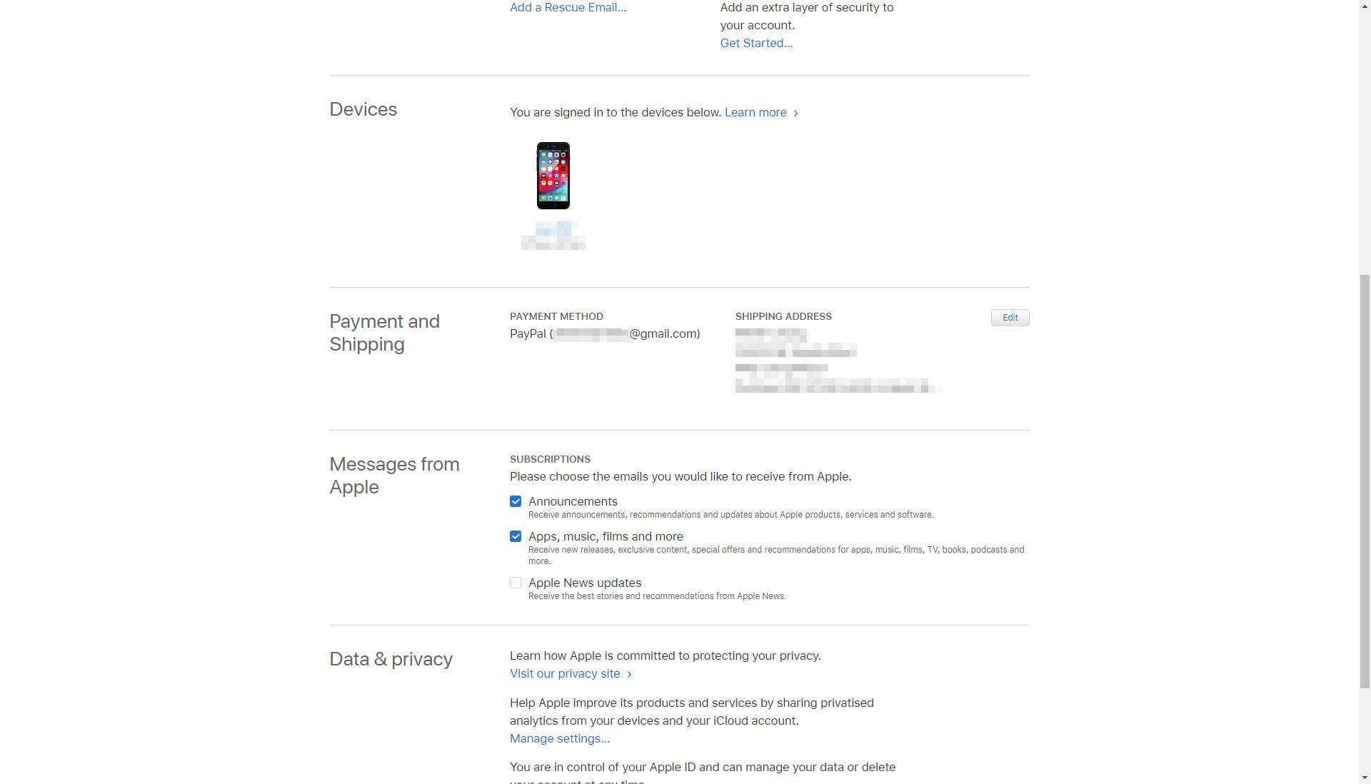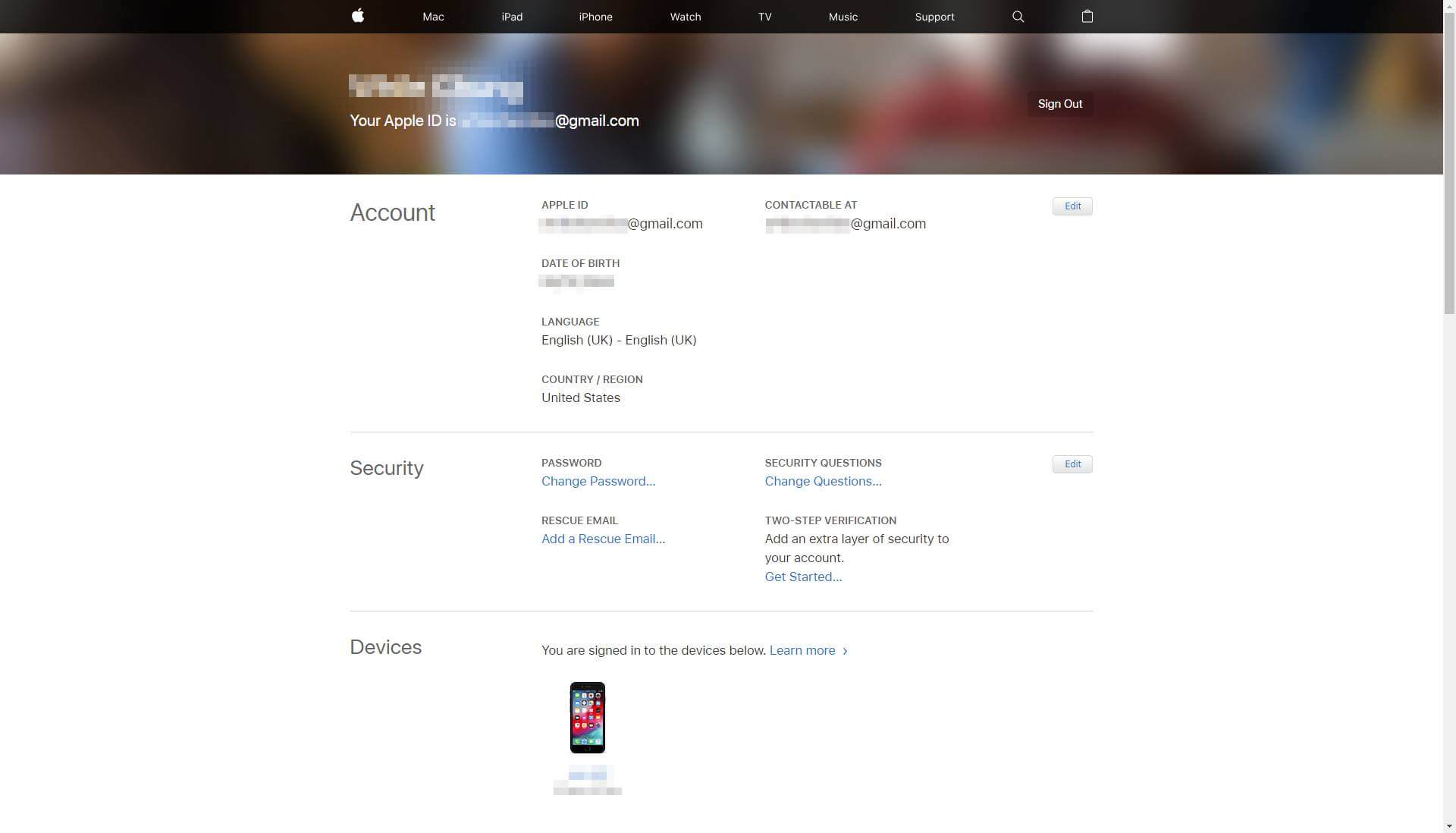 和 PayPal 客服沟通完成后,我是直接登录 Apple ID 的网页端操作绑定 PayPal,没有在手机端操作。打开 [appleid.apple.com],输入账号密码后,进入美区 Apple ID 账户信息首页: