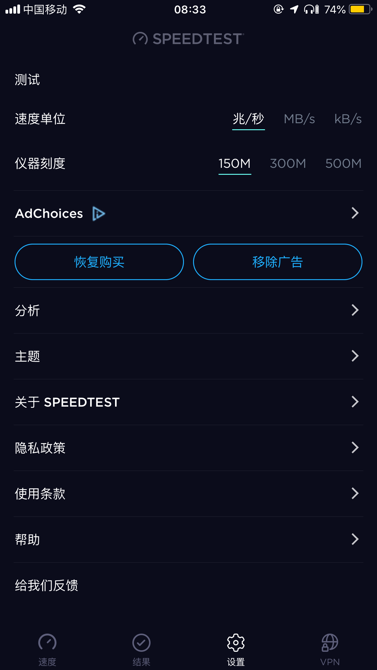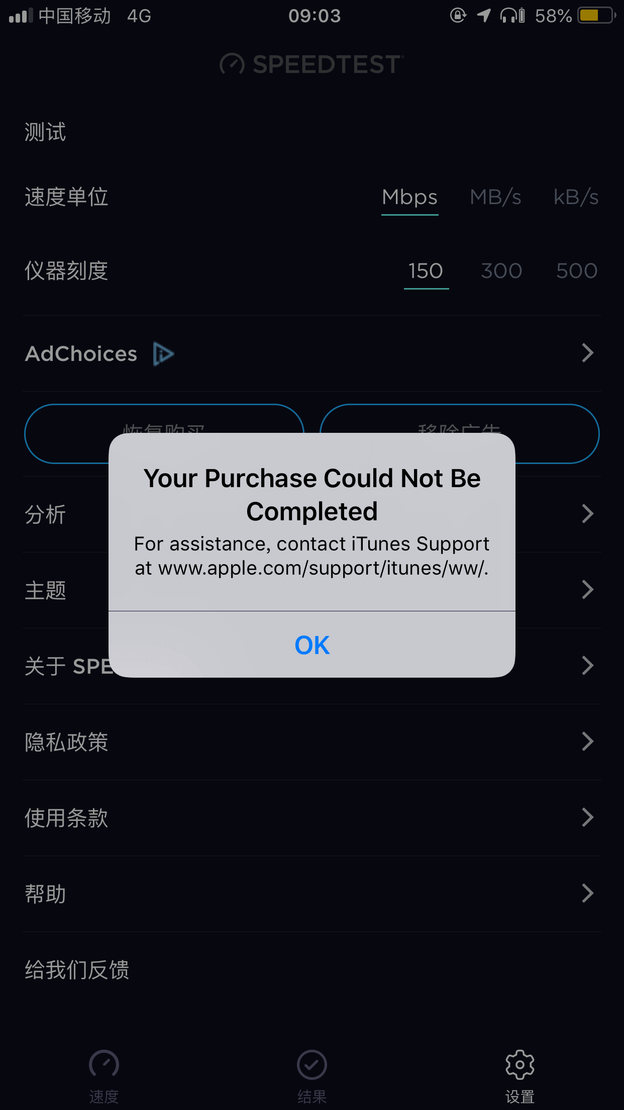 在这之后随意打开一个可以进行 IAP(In-App Purchases 应用内购买)付款的 App,例如 Speedtest App,进入 Speedtest 设置 页面: