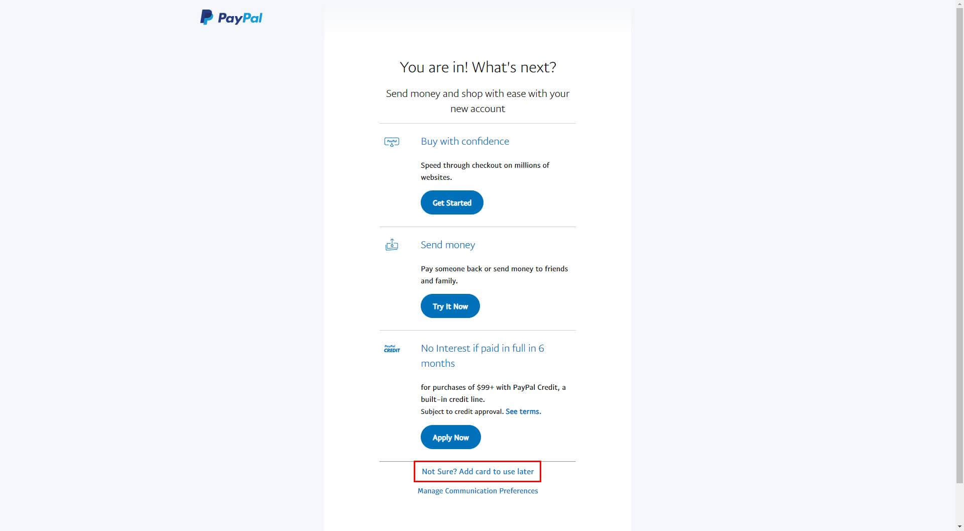 至此,PayPal 已经注册成功,然后点击最下面按钮 Not Sure? Add card to use later,并添加 VISA 信用卡(我这里绑定的是国内招行 VISA 卡,理论上其他双币卡都可以):