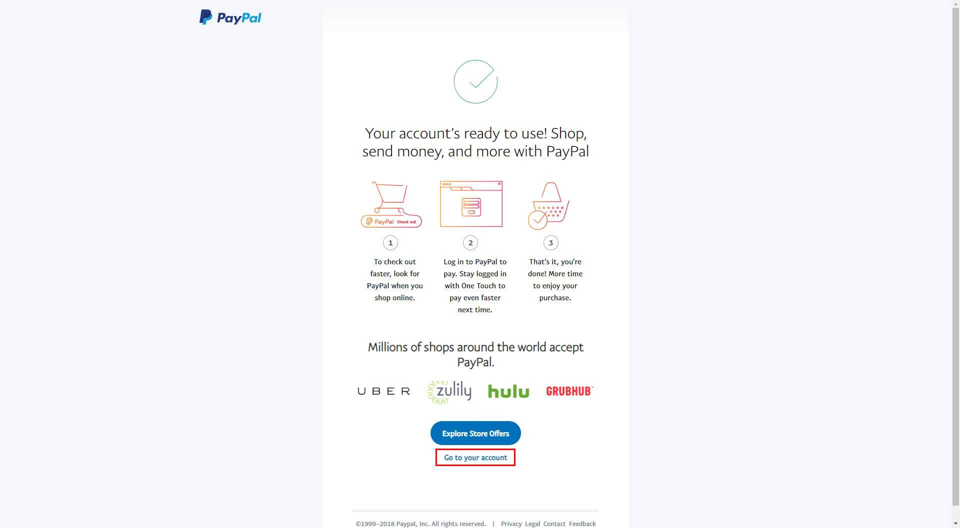 这时 PayPal 提示账户已经全部准备好可进行后续使用,点击下方 Go to your account,进行账户最后验证(验证邮箱和电话,这点很重要,如果没有验证,将 100%被风控!)