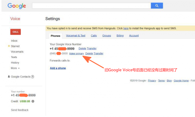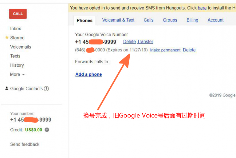 此时,返回网站查看,账号上已经有两个 Google Voice 号了,但旧 Google Voice 号后面有过期时间: