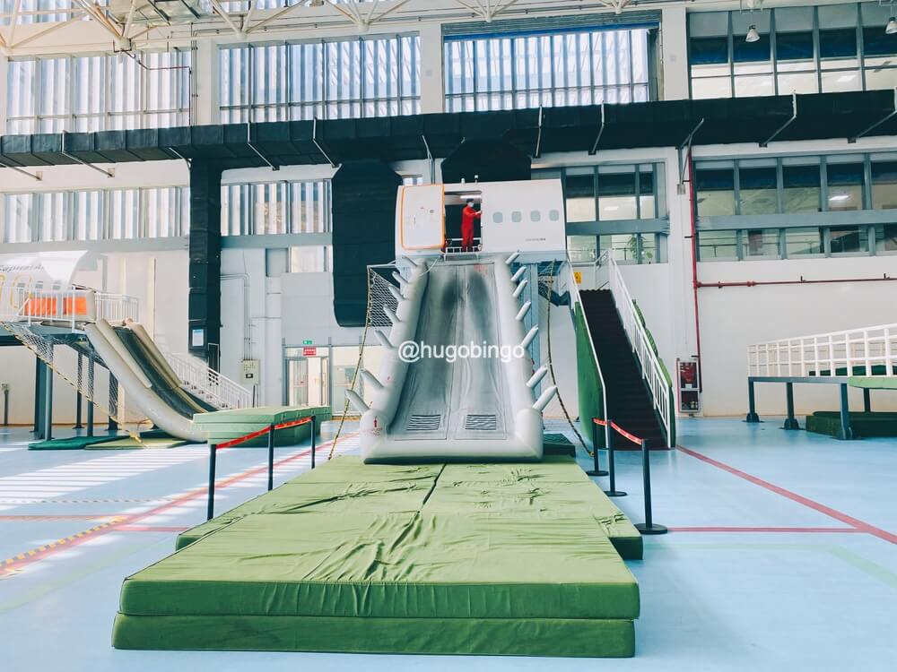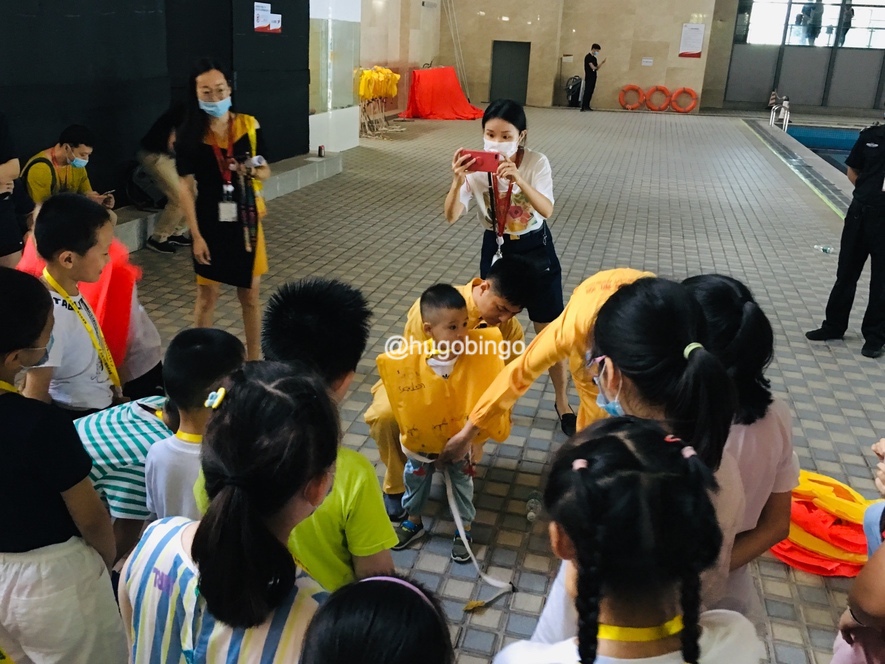 体验完逃生滑梯,到了最后的水上项目,讲解员认真的和孩子们讲解当飞机迫降在水上时的小知识,还有小小朋友的救生衣穿戴示范。