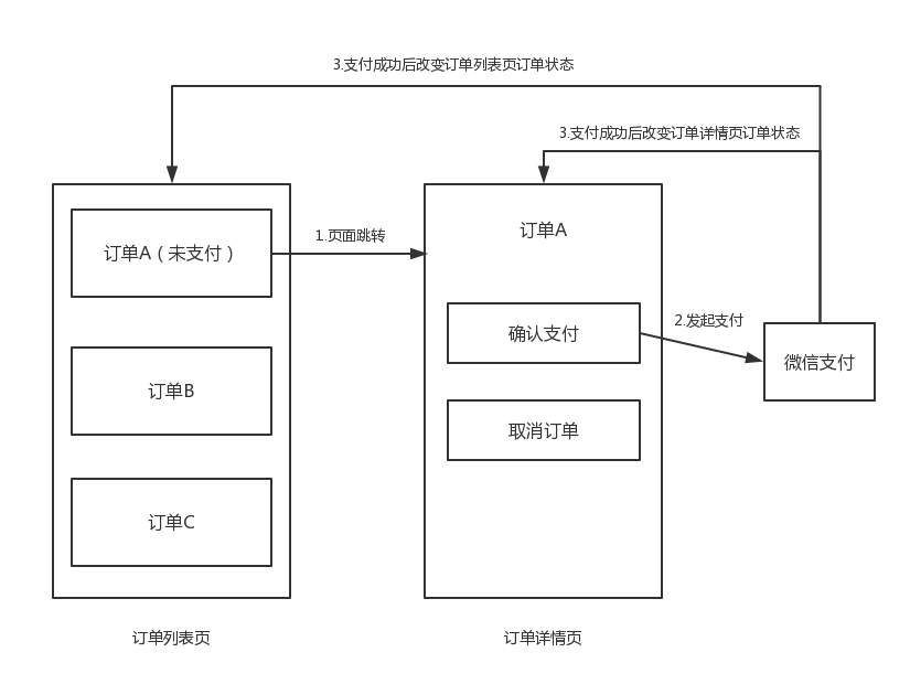 想象一个业务场景,用户首先进入订单列表页。然后点击其中一个订单,进入到订单详情页。当用户在订单详情页对订单进行操作,例如支付、确认收货等时,该订单的状态就会发生改变。此时需要对上一级的订单列表页中该订单的状态进行更新: