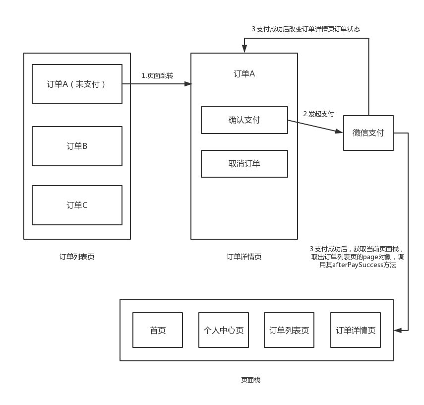 如果订单详情页里能拿到订单列表页的 Page 对象,就能去调用它的 setData 方法。小程序提供了一个方法 getCurrentPages,执行它可以得到当前页面栈的实例,然后再根据页面进栈的顺序我们就能拿到订单列表页的 Page 对象。