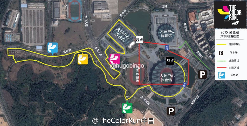 翻看 Color Run 的官方微博,还能找到当时的日程安排和龙岗大运中心的彩跑路线图。